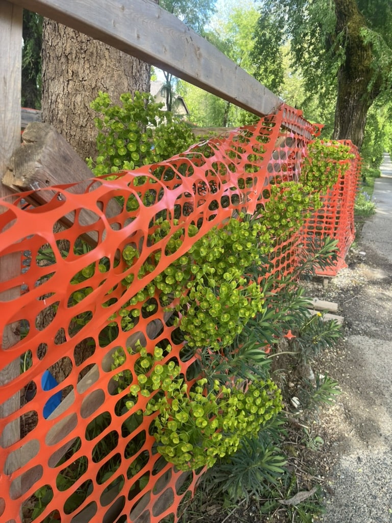 Can't walk through the neighbourhood without appreciating the woodland trees-I assume-it's named for, and some stubborn Mediterranean spurges pushing through construction fencing.