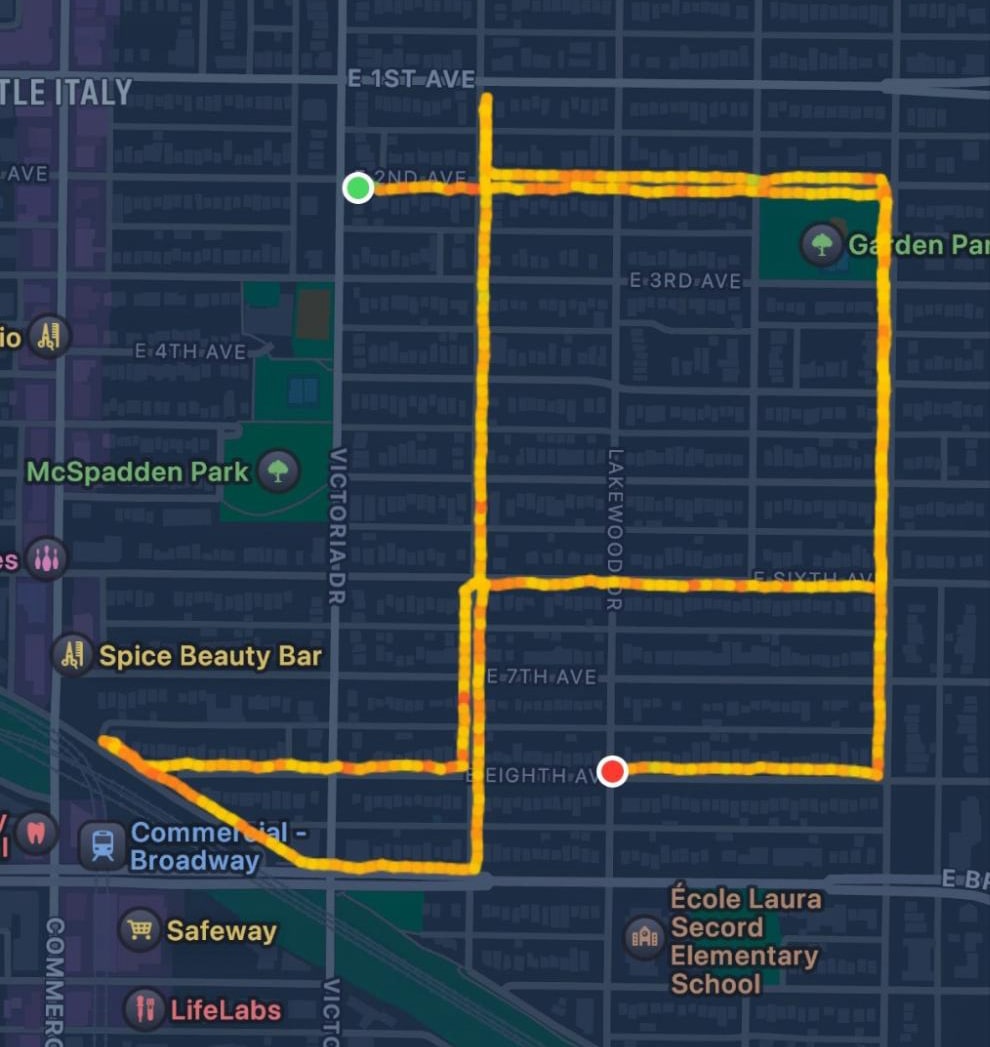 We gave up somewhere along E 8th Ave, dropping right there at the bend of the sidewalk without a care (no one was really walking this area, to be fair)
