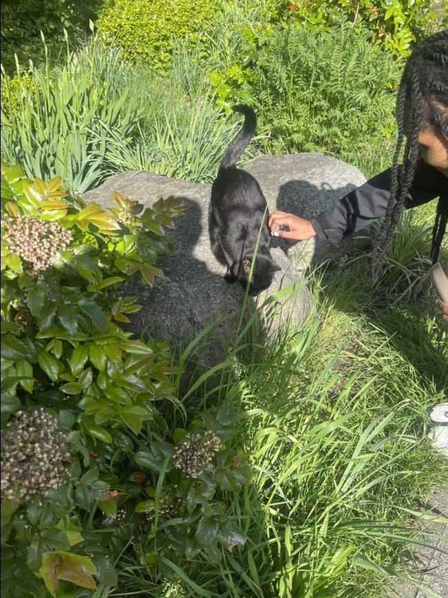 A black cat in the bushes by N Grandview Hwy. Vi went right up to it. I could only admire enviously from a distance.
