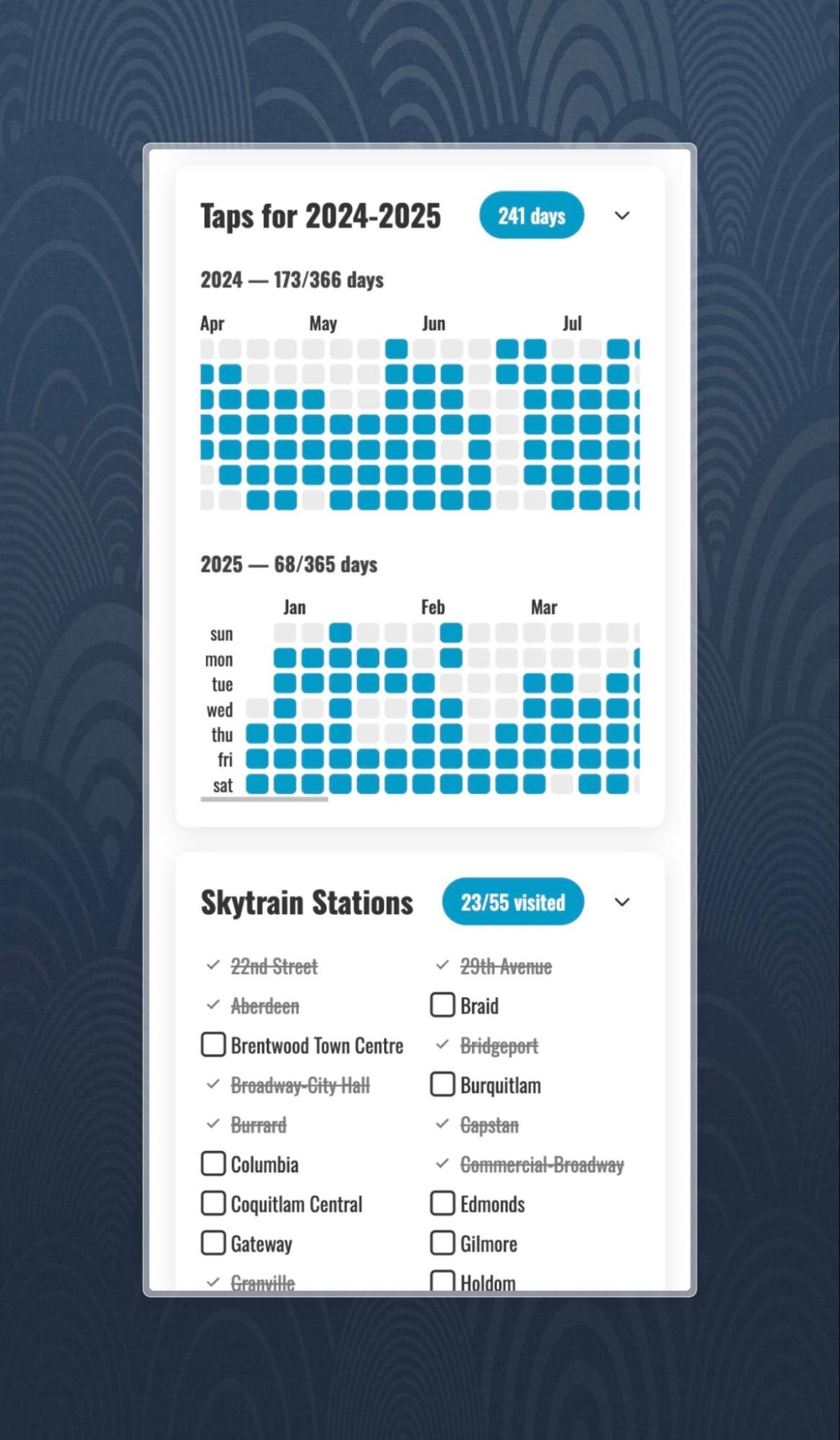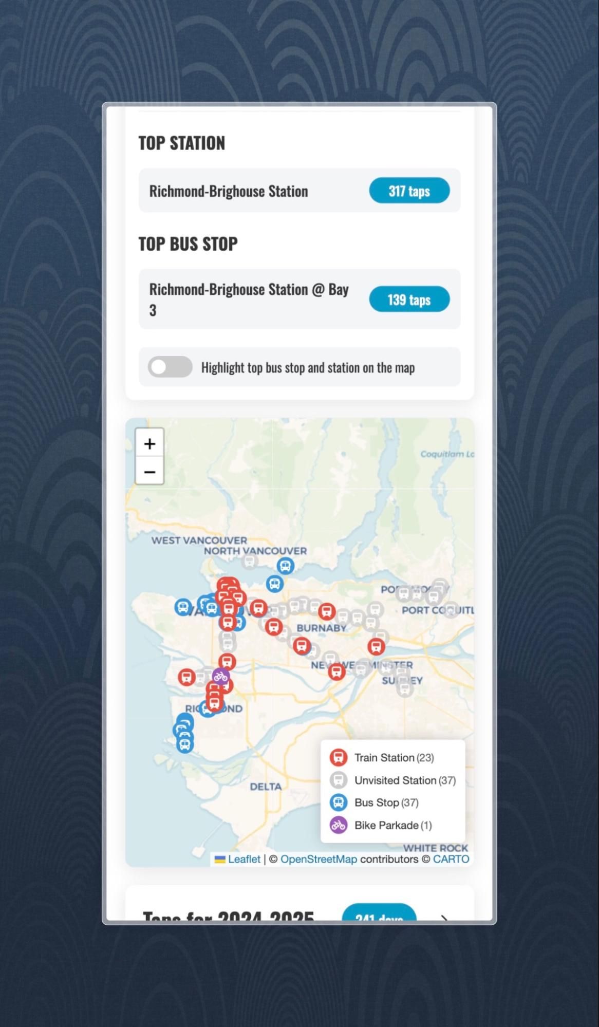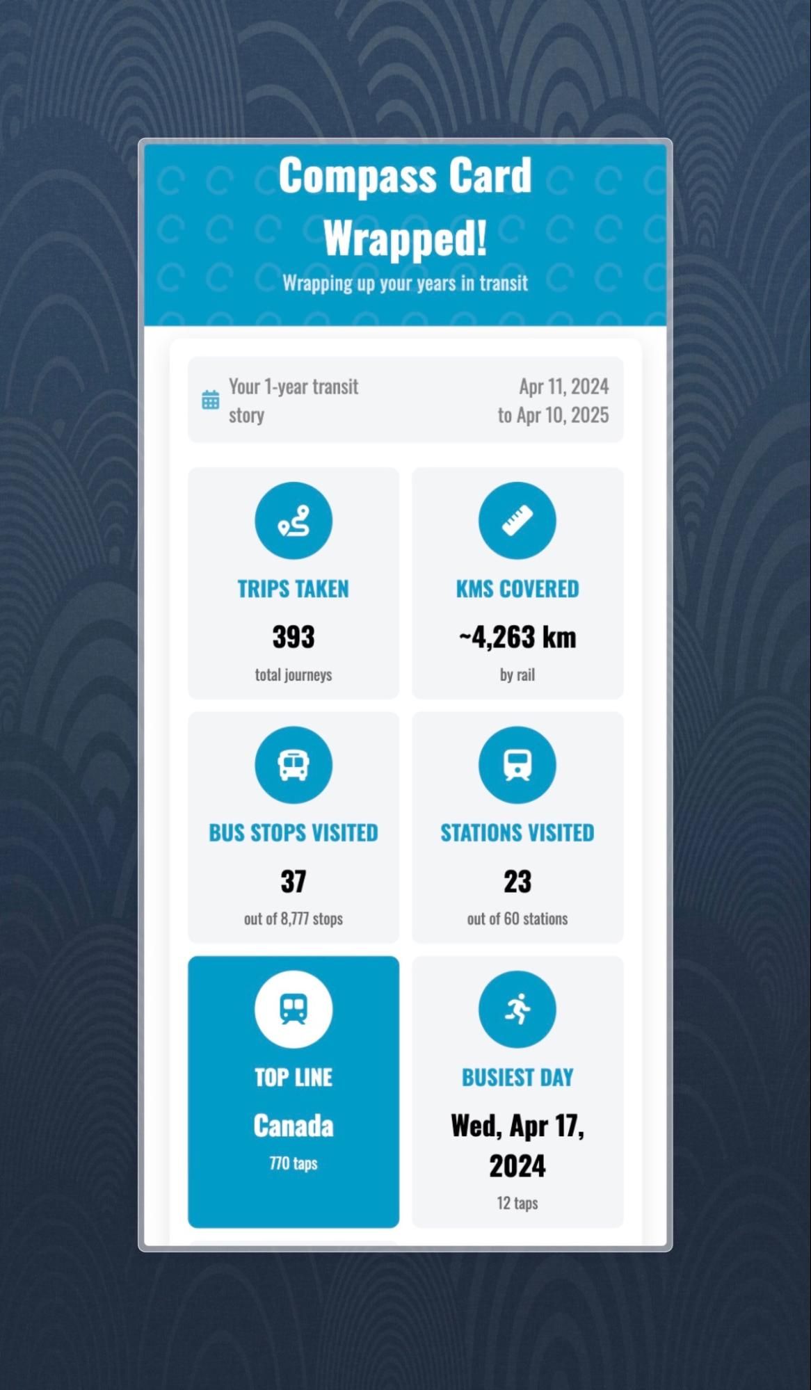 That curiosity manifested as Compass Wrapped, a Spotify-Wrapped-inspired breakdown for Metro Vancouver transit users. More about that in this dedicated blog post: Creating Compass Wrapped!
