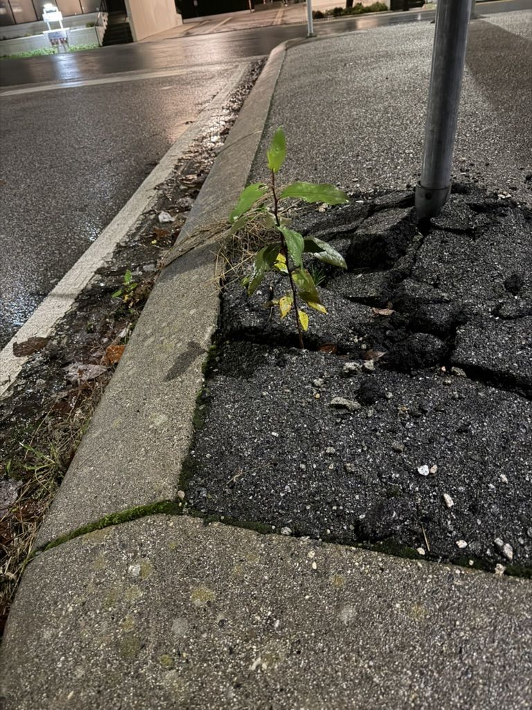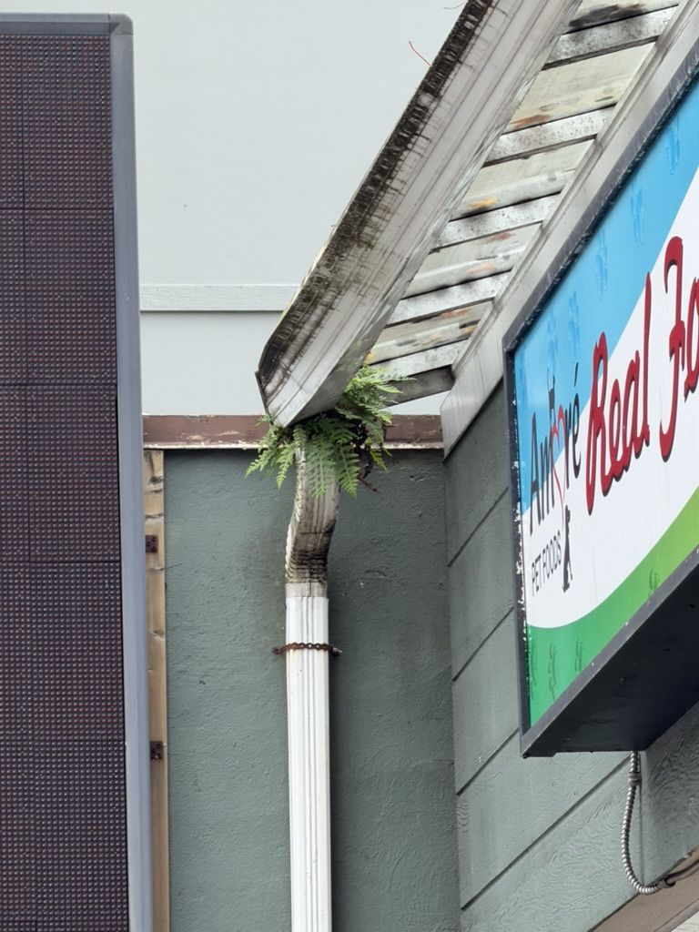 flora growing at unexpected places in the water near the New West quay, at a median strip in Brentwood, and in the roofing of a rundown store at Capitol Hill