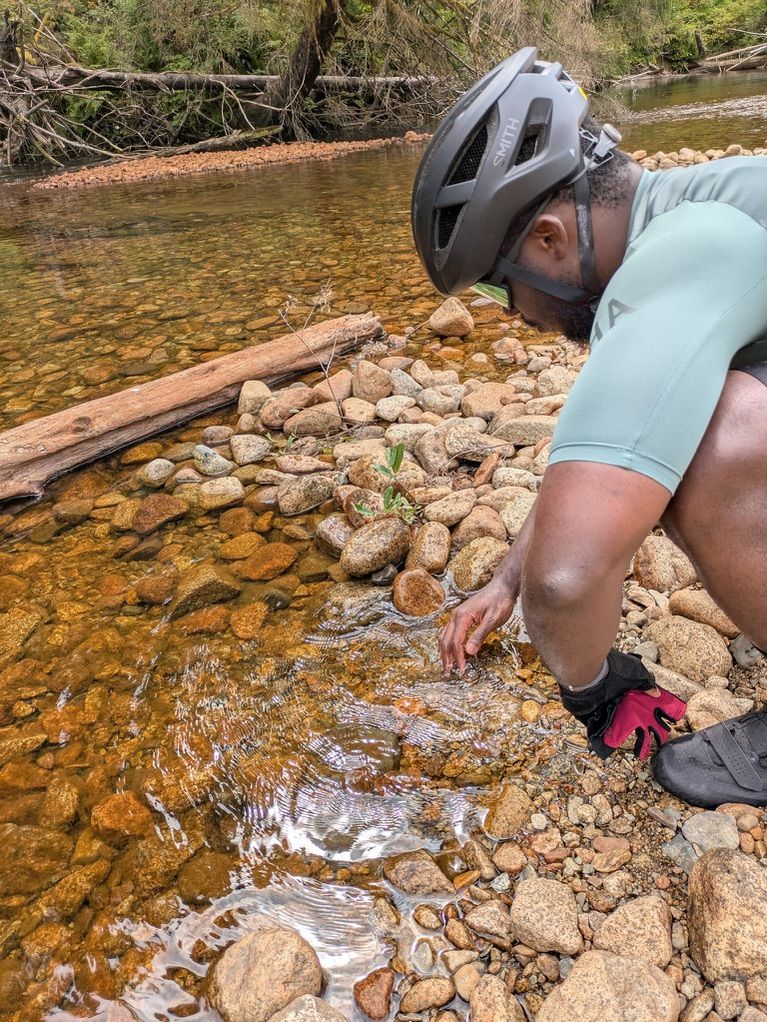 views from cycling: mirror selfie with PK, basilia (my gravel bike), me at demo forest, and at a stream off the trails